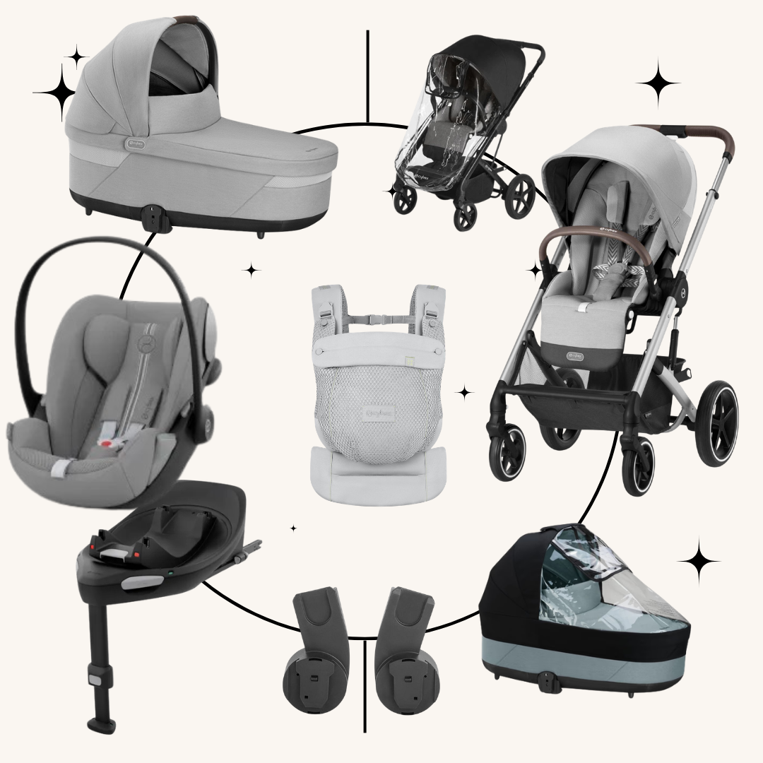 Set kočárku Cybex Balios S Lux s hlubokou korbičkou, adaptéry, autosedačkou Cybex Cloud G i-Size Plus, otočnou isofix bází Cybex Base G, nosítkem Cybex Amya a originálními pláštěnkami