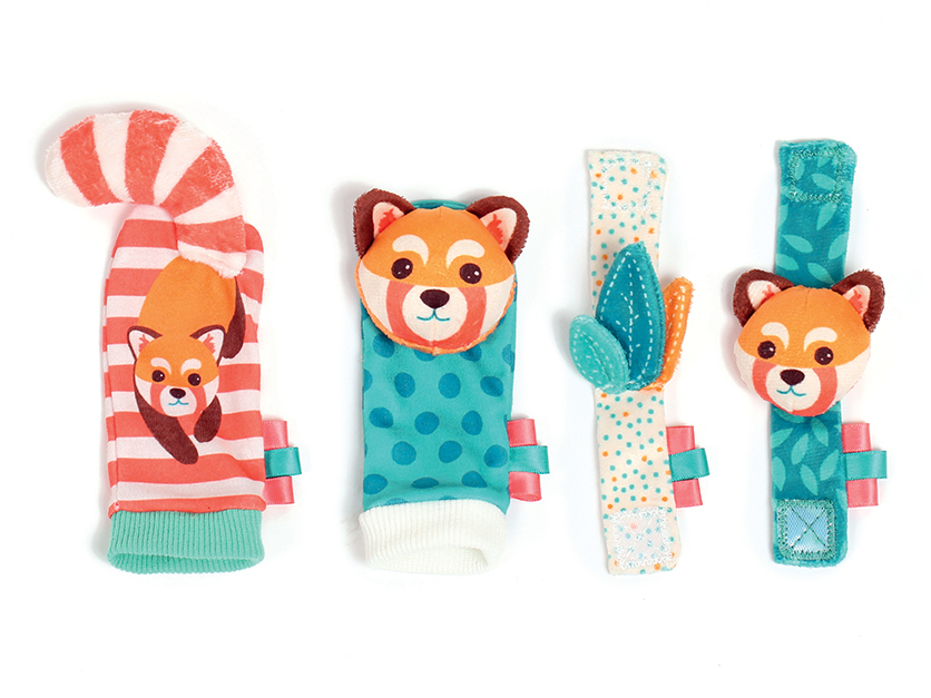 Chrastítka s veselými obličeji pandy podněcují rozvoj sluchu, zraku a hmatu dítěte. Chrastítka se snadno připevní s pomocí suchého zipu dítěti na zápěstí a navléknou na nožičky. Dítě se otáčí za zvukem a sleduje výrazné barvy hračky. Různorodé textury pro zkoumání pomáhají rozvoji hmatu.