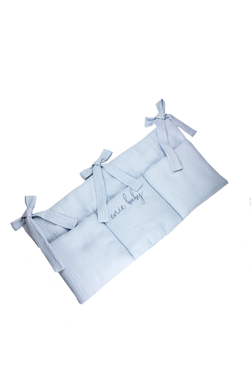 Kapsář na postýlku z mušelínu má tři prostorné úložné kapsy na ukládání hraček, deček, dudlíků a dalších nezbytností, jako jsou plenky nebo vlhčené ubrousky. Kapacita kapsy je 4- 8 plenek. Místo na vše, co chcete mít po ruce. Pomocí tří horních mašlí ho snadno zavěsíte kamkoliv. Celkové rozměry 60x30 cm.
