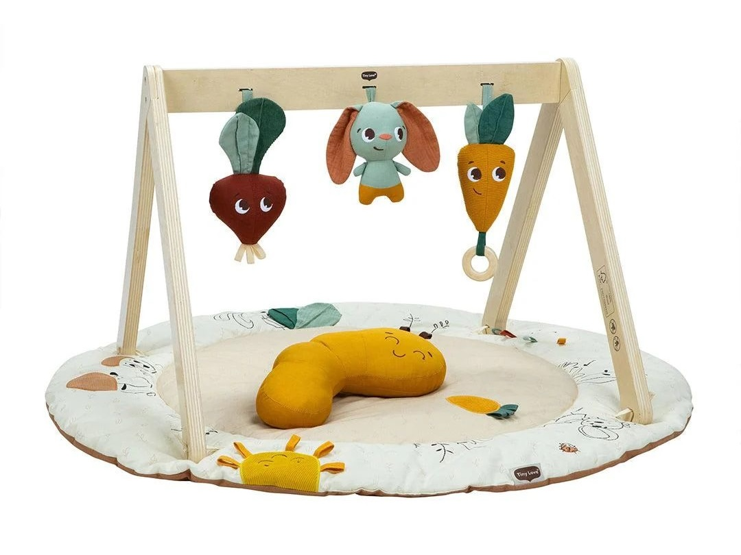 Odnímatelná dřevěná hrazda umožňuje zavěšení hraček v podobě chrasticí řepy, roztomilého králíčka a mrkvičky s kroužkem pro uchopení. Přímo na dece najdete textilní aplikace s různými texturami a stážkami pro zkoumání.