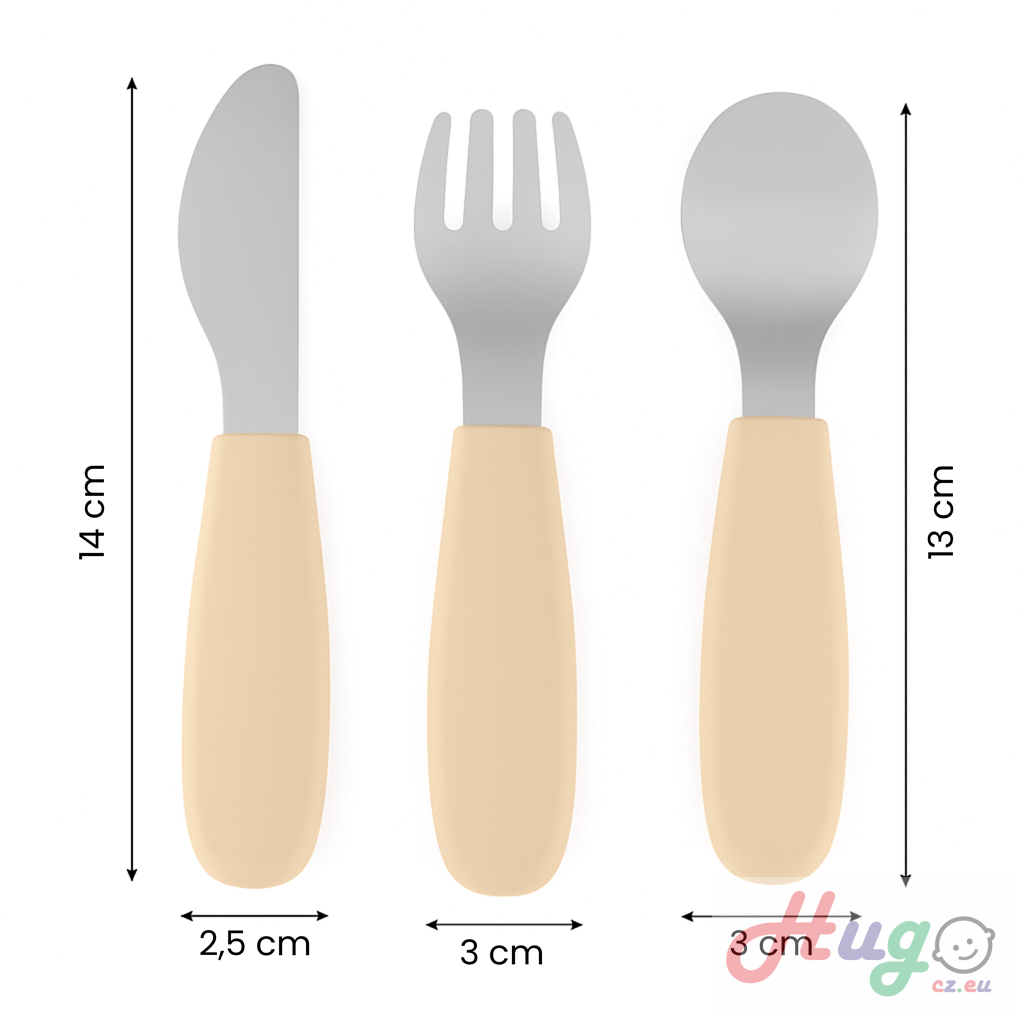 - Rozměry: lžička a vidlička – 13 × 3 cm, nůž – 14 × 2,5 cm