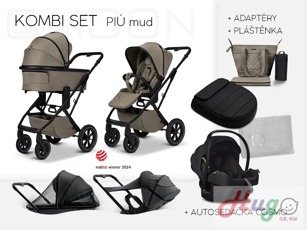 Výhodná sada PIÚ EXTRA obsahuje nánožník na sportovní verzi, autosedačku COSMO Black, pláštěnku a adaptéry na autosedačku.